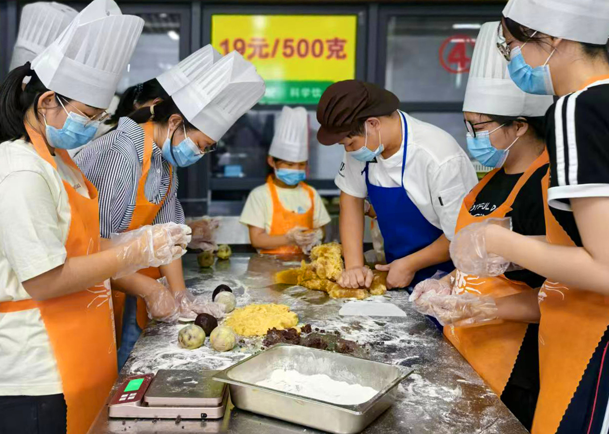 本次主题活动内容丰富,形式多样,旨在让学生在体验中感悟,在实践中传承。制作月饼环节由学生在面点师的指导下,完成搓皮包馅,用学校专用的校徽摸具印制成型,接着送入烘炉烤制,在香甜的月饼香味中完成封装;面点师在传授月饼制作的同时,还为学生解读了校徽的深刻内涵,也让美食和校徽之间连上了深深的感情印记;游戏环节安排了投壶、海底捞月等竞赛,让学生放下手机,在饮食服务人员的指导下,和小伙伴们密切配合,完成各项竞赛任务,既锻炼了学生动手能力,也增加了与食堂服务人员的交流。