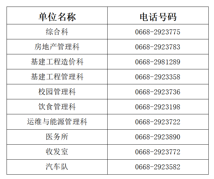 总务后勤部办公电话一览表
