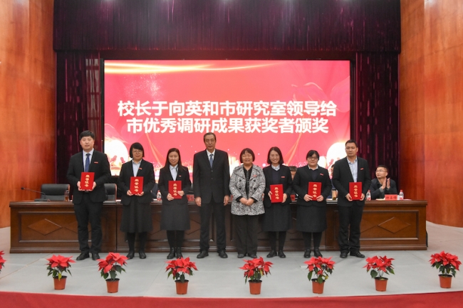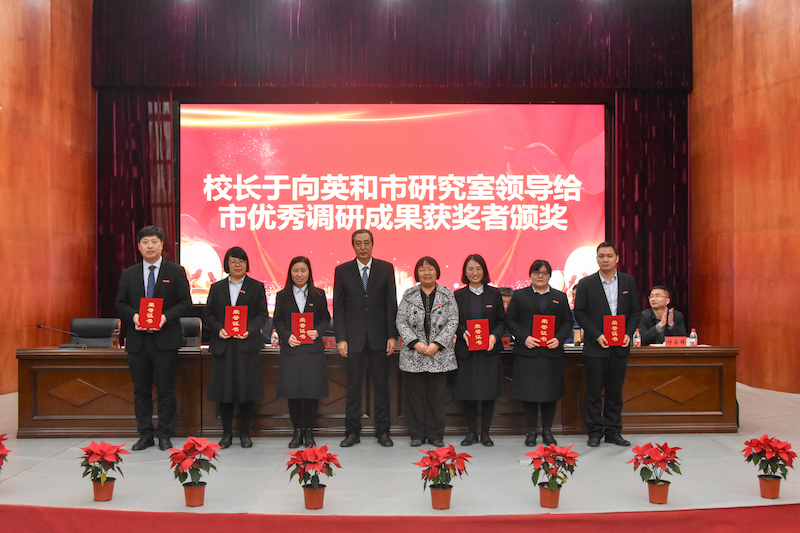 常务副校长李庆阳宣读获得市政府决策研究优秀成果和市级重点项目结项的表彰文件。校长于向英与市研究室领导为获奖个人颁奖,常务副校长李庆阳与市研究室领导为市级重点项目结项颁发证书,党委副书记董学力与市研究室领导为校地合作联络员颁发了聘书。