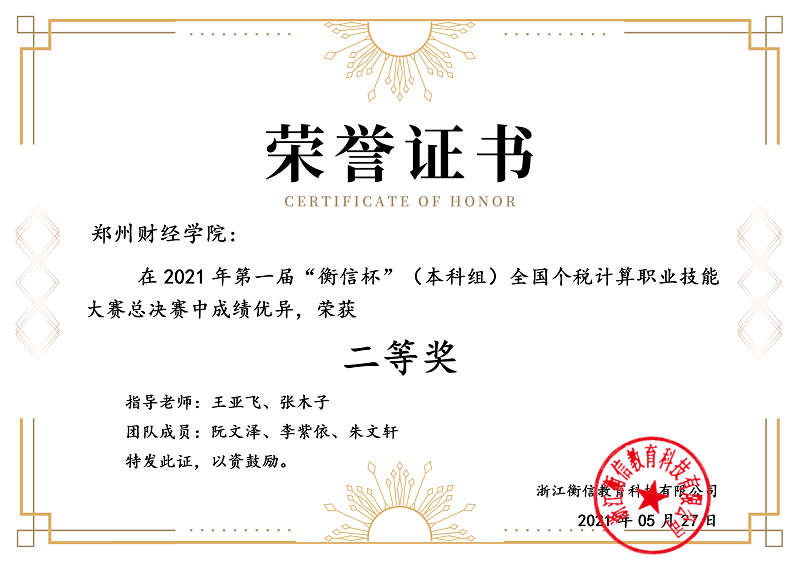 近日,由浙江衡信教育科技有限公司主办的2021年第一届“衡信杯”(本科组)个税计算职业技能大赛总决赛结果揭晓,开云官网会计学院学子阮文泽、李紫依、朱文轩同学组成的代表队,在王亚飞、张木子老师的带领下,最终赢得二等奖。