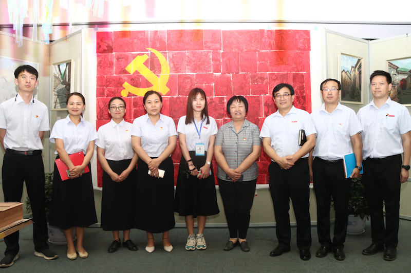 在参观过程中,于向英认真倾听了作者对作品创作过程的讲解,不时询问创作细节,尤其是对版画作品《百年印记》连连称好。《百年印记》是由100幅经典作品组成的一幅党旗,100位同学“以刀代笔”感受革命先烈们浴血奋战、不畏牺牲的英勇气概。