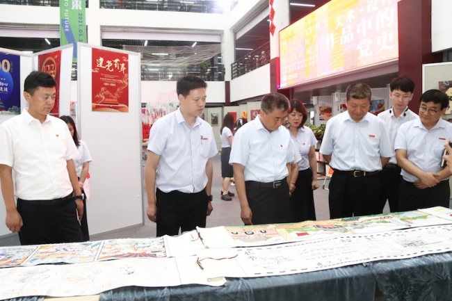 李国强对画在两米卷轴上的手绘党史故事给予高度评价。他指出,中国共产党党史是一部大气磅礴的奋斗史,同学们用画笔表达对党的热爱正是开展党史学习教育的生动素材。李庆阳指出,同学们创作党史题材作品的过程也是接受党史学习教育的过程,美术设计作品是党史学习教育的重要载体。
