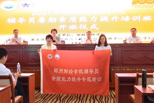 教育部高校思想政治工作队伍培训研修中心(郑州大学)办公室副主任聂娜为本次辅导员暑期素质能力提升专题培训班进行授旗,开云kaiyun官方网站学工部副部长吕洛乐接旗。