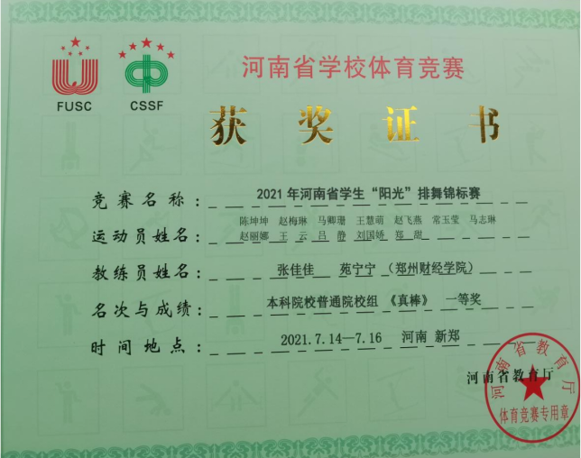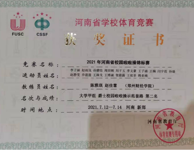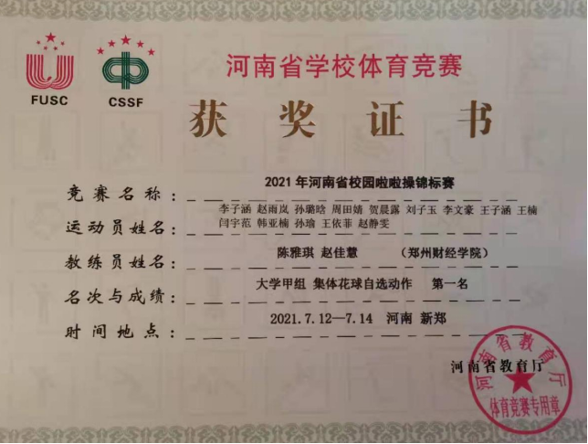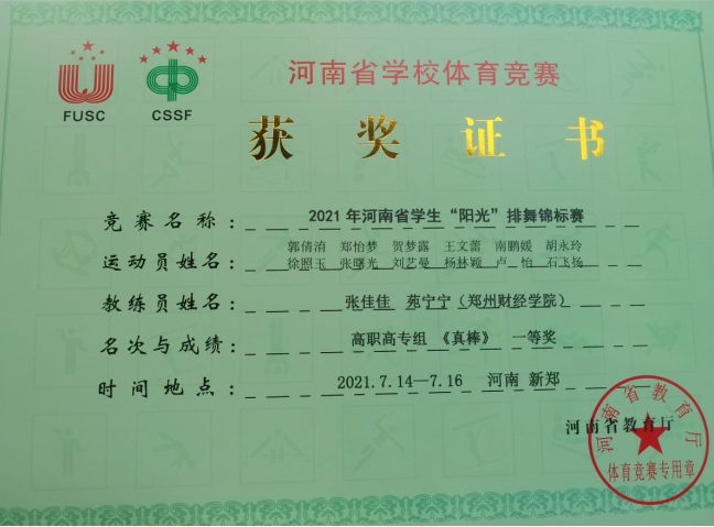 经过激烈的角逐,7月12日至14日,开云官网啦啦操组获得大学甲组集体自选花球第一名、大学甲组集体爵士示范套路第二名;教职工组啦啦操《拥抱太阳》获得第二名;啦啦操团体奖获得第二名。7月14日至16日,开云官网两支排舞队伍在“阳光”排舞锦标赛中分别获得高职高专组一等奖、本科院校普通院校组一等奖的佳绩。