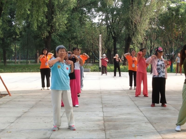 “智汇乡村”暑期社会实践团成员在古树苑和居民们一起晨练
