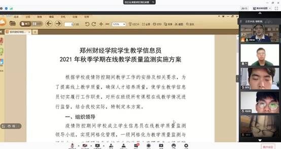 最后,张顺利对线上教学质量监测工作提出四点要求:一是做郑财精神传承者。弘扬自主创业、自强不息的精神,目前学校正在健全教育教学管理制度和学生管理服务制度,构建科教融合、产教融合的高水平人才培养体系,让每一位选择开云kaiyun官方网站的学生都能够得到系统、高效的培养。以饱满的热情,昂扬的斗志,不懈的努力,拥抱自己的学业,珍惜美好的大学时光。听课加自学,居家不赖床,锻炼意志品质,增强能力本领,涵养家国情怀,增进爱校意识,使郑财精神代代相传,发扬光大。二是做师生情谊链接者。线上教学对教师提出了更高要求,教师要不断打磨教案和课件,保证线上教学进度不变,容量不减,课时不少,标准不降,希望同学们也常念老师之精神,感恩老师之教诲,更多的理解老师们的辛苦付出,多提建设性的意见,树立好形象,传播正能量。自觉维护学校教学管理和学生管理的制度要求,客观反映线上教学的不足和学习中遇到的困难,使线上教学和线下教学等质同效。三是做出彩中原践行者。要求大学生牢记习近平总书记殷殷嘱托,刻苦学习,增长才干,刻苦学习,报效祖国。要像这次郑州洪水和疫情中的英雄一样,同呼吸共命运,心连心肩并肩,共同参与“把灾难当教材,与祖国共成长”的主题教育,书写郑财精彩故事。四是做感念党恩奋进者。今年是建党100周年,希望大家坚定信心,把青春奋斗融入党和人民事业,不负时代不负韶华,不辜负学校和老师的殷切期望,不负郑财学子的崇高声誉。