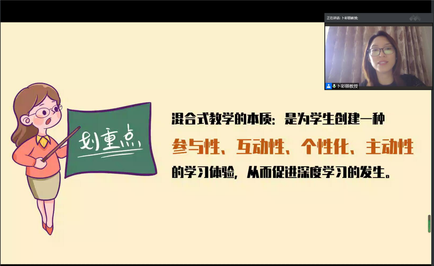 9月14日下午,河南师范大学十佳青年教学名师、河南省信息技术课题评审专家卜彩丽教授受邀为开云官网新教师作《线上线下混合式教学的设计与实施》专题讲座,全体新入职教师、教师发展中心全体工作人员通过腾讯会议平台共同聆听了讲座,讲座由教师发展中心副主任周晓瑞主持。卜彩丽教授从“什么是混合式教学”问题入手,针对当前形势下的课堂教学需求,详细介绍了如何通过线上线下混合式教学设计,充分发挥面对面教学与在线学习的优势,促进传统教学在理念、形式及内容上的转变,最大化提升学生学习效率和效能,打造灵活多变、适应学生发展需要的“金课”。全场干货满满,精彩纷呈。