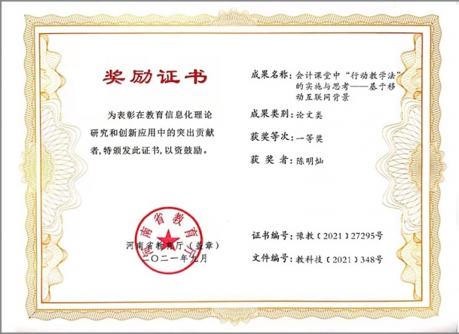 10月9日,根据河南省教育厅下发的《河南省教育厅关于公布2021年度河南省教育信息化优秀成果奖获奖名单的通知》文件(教科技〔2021〕348号),开云官网会计学院会计工作室(郑州市优秀技术技能名师工作室)阶段性成果“会计课堂中‘行动教学法’的实施与思考——基于移动互联网背景”被评为一等奖。