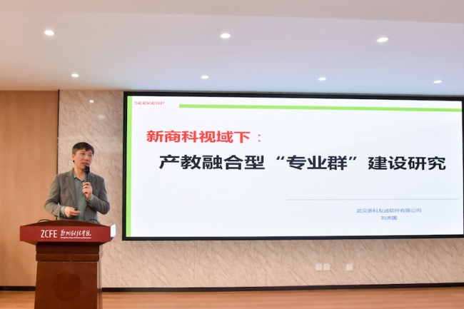刘善国教授作题为“新商科视域下产教融合型专业群建设研究”的主旨演讲,分析企业数字化转型背景下商科类专业群与企业岗位链深度融合的具体路径,阐述校企联合人才培养的机制体制。
