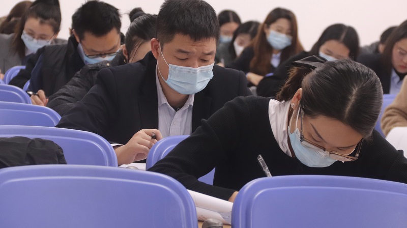 为切实提升学习测试的实效性,本次测试前,学工部结合教育部令第43号《普通高等学校辅导员队伍建设规定》《新时代高校辅导员素质能力提升教程》进行出题,考试题型包括单选题、多选题、简答题和论述题,测试采用闭卷方式。本次测试由学生工作部部长和思政科全体老师负责监考。参赛辅导员们备考充足,沉着冷静,奋笔疾书,展示出扎实的理论功底和良好的精神风貌。