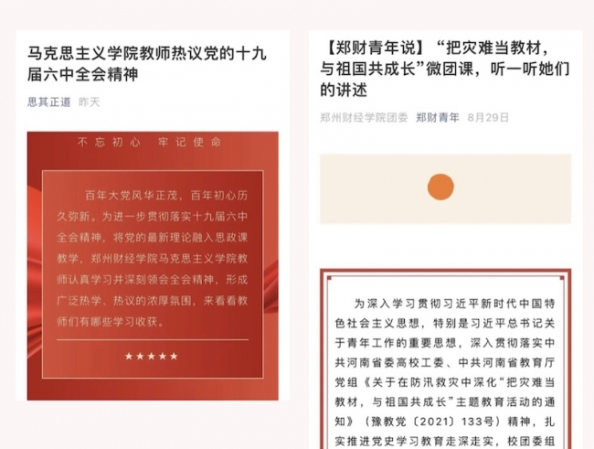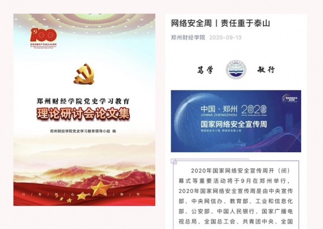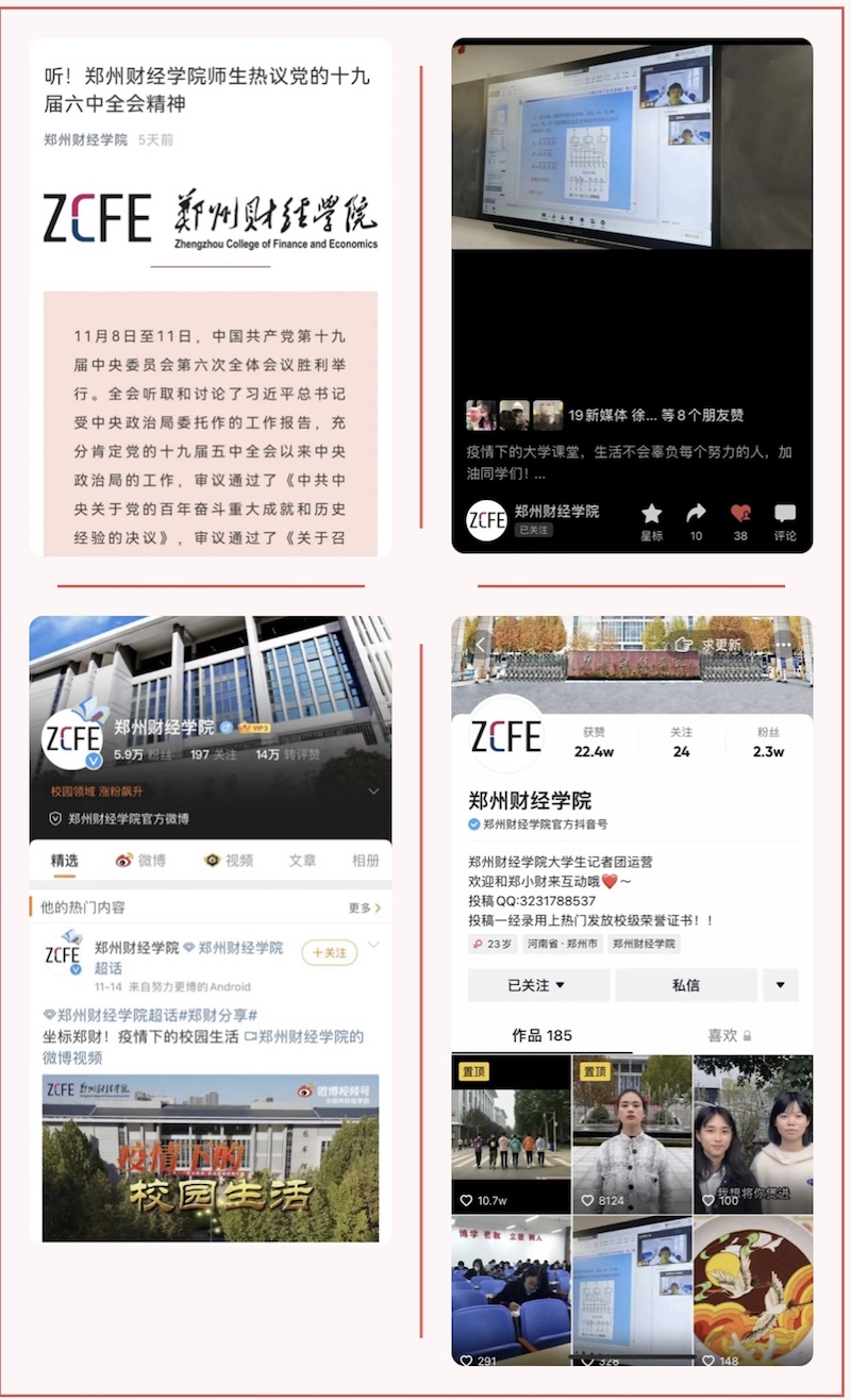 充分发挥学科优势。利用学科专业优势,发挥各类媒体传播特色,推动多种媒体协同发力,扎实推进习近平新时代中国特色社会主义思想进网络,用师生喜闻乐见的话语讲述中国故事、河南故事、郑财故事,全景式展现学校办学特色和成就。马克思主义学院网络新媒体平台传播马克思主义理论和红色思想;教育学院微信公众号开展形式多样的爱国主义教育活动宣传;校团委官方微信公众号组织和推送大量关于师生思政教育和文化活动的内容;网络中心平台大力宣传计算机安全、移动终端安全、个人信息安全、及安全事件处置等信息。