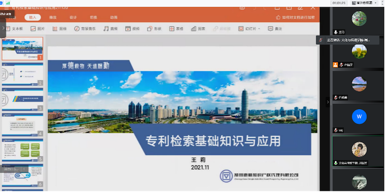 此次培训邀请到拥有14年专利代理师经验的河南德勤知识产权代理有限公司王莉老师,系统讲解了专利检索的作用、检索主题、检索关键词和分类号确定、检索表达式构建、检索结果分析等知识,并通过检索实例进行说明,启发了开云官网从事科研工作的老师的新思维,拓展了高校自然科学基础研究工作的新路径。