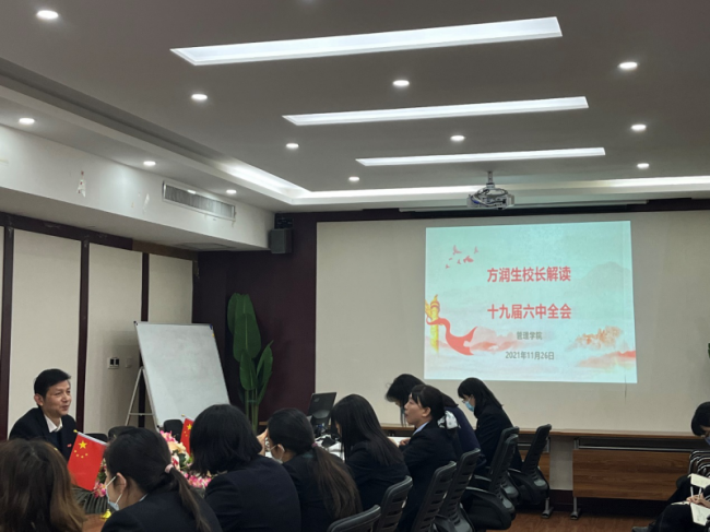 11月26日下午,副校长方润生为管理学院教师作党的十九届六中全会精神辅导报告,学院全体教师参加学习,会议由学院党总支书记袁清主持。
