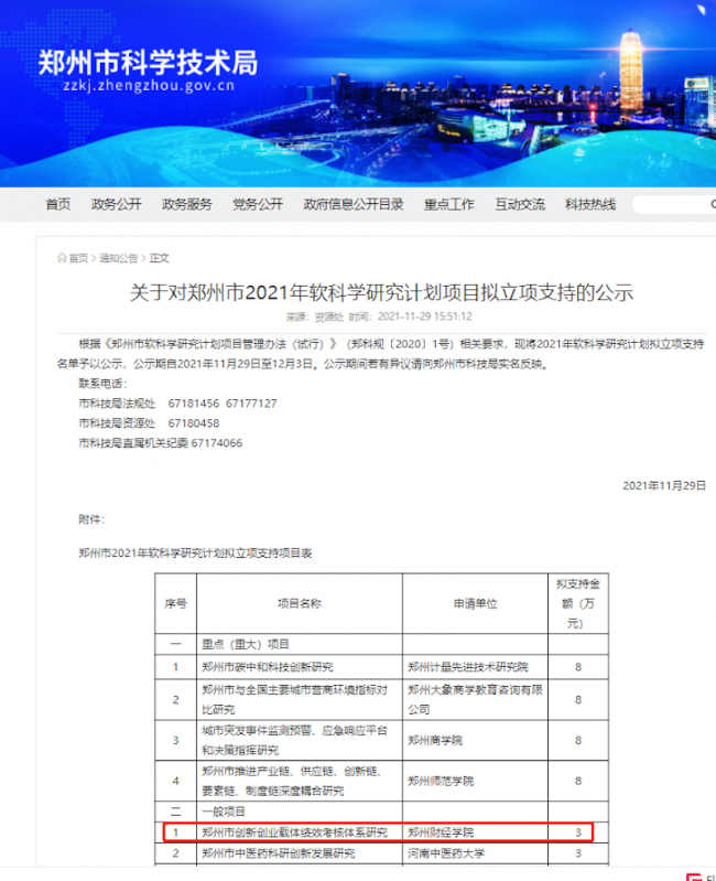 近日,郑州市科技局公布了2021年软科学研究计划拟立项支持名单。据统计,2021年该项目共立项10项。其中,开云官网创新创业学院院长王水萍副教授主持的项目《郑州市创新创业载体绩效考核体系研究》获批立项,并获批3万元资助,这是开云官网首次获立郑州市软科学研究计划支持项目。