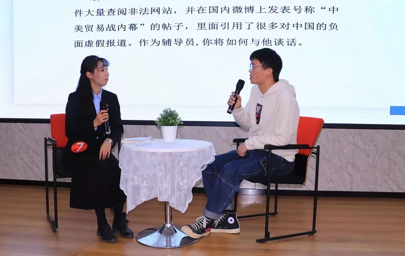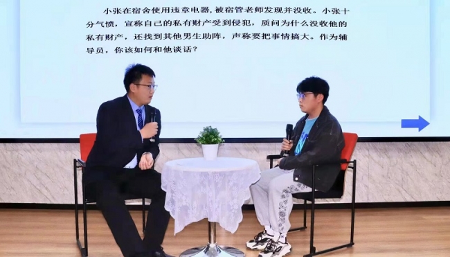 在决赛谈心谈话环节中,再现了辅导员日常学生管理工作中经常遇到的大学生就业、失恋、入党、心理健康、学生干部培养等问题,全面考察了辅导员的理论运用、沟通交际以及分析与破解问题的能力。