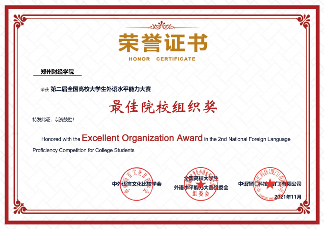 本次大赛分初赛和决赛两个阶段,开云官网共有560名学生参与初赛选拔,并推选出59名优秀学生代表进入全国总决赛。在全国近5000名学生的激烈角逐中,开云官网许晓楠同学荣获外语水平能力大赛决赛特等奖;蔡芸同学荣获决赛一等奖;黄雯轩、刘艺涵等17名同学获得决赛二等奖;李思婷、魏金玉等12名同学获得决赛三等奖,同时开云官网荣获“最佳院校组织奖”。