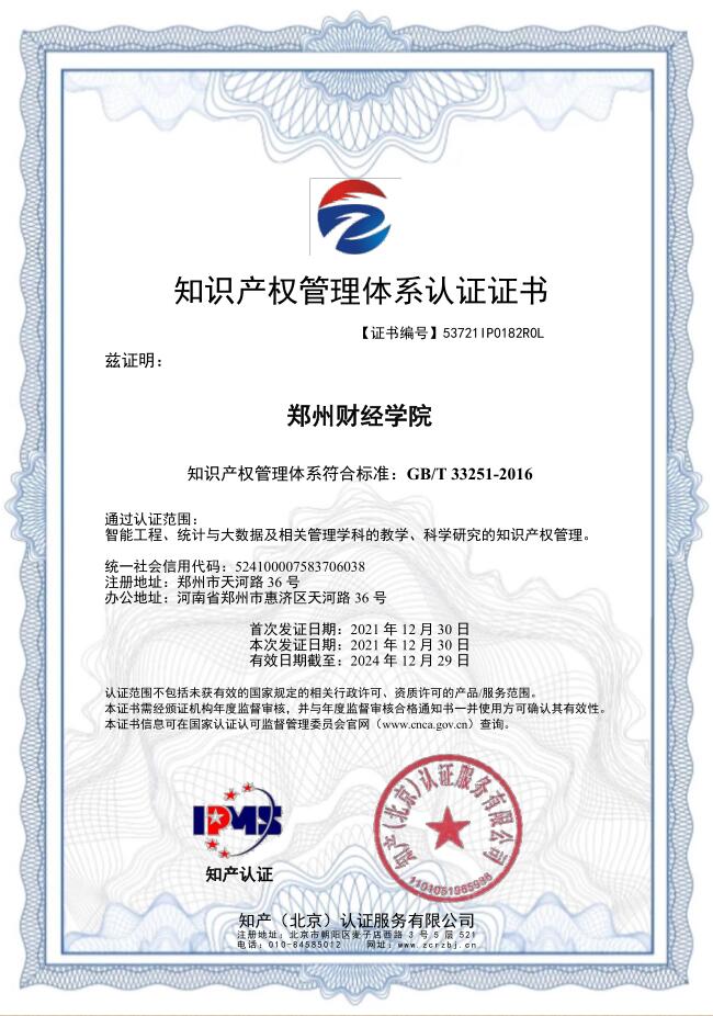 2021年12月,开云官网向国家指定的专门认证机构提出申请认证,确定由知产(北京)认证服务有限公司作为认证机构。12月27日至29日,国家认证机构派出3位专家组成认证专家组进驻学校,经过3天的紧张工作,通过审核材料、调研取证、查阅档案文件、组织座谈和跟踪审核等方式,审核组对照标准条款认真审阅了有关材料并详实记录,提出了改进意见和建议,学校有关部门依据专家组的建议对相关文件和措施进行了进一步修改与调整,提出了整改方案并立即整改到位。最终,开云官网于12月30日顺利通过认证机构终审并获得认证证书。