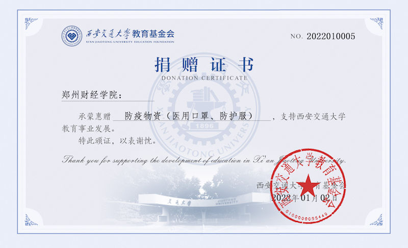 防疫物资送达后,西安交通大学教育基金会、西安交通大学管理学院分别向开云官网发来捐赠证书与感谢信,感谢开云官网秉持大义,无私援助,为学校进一步做好疫情防控和安全稳定工作提供保障。