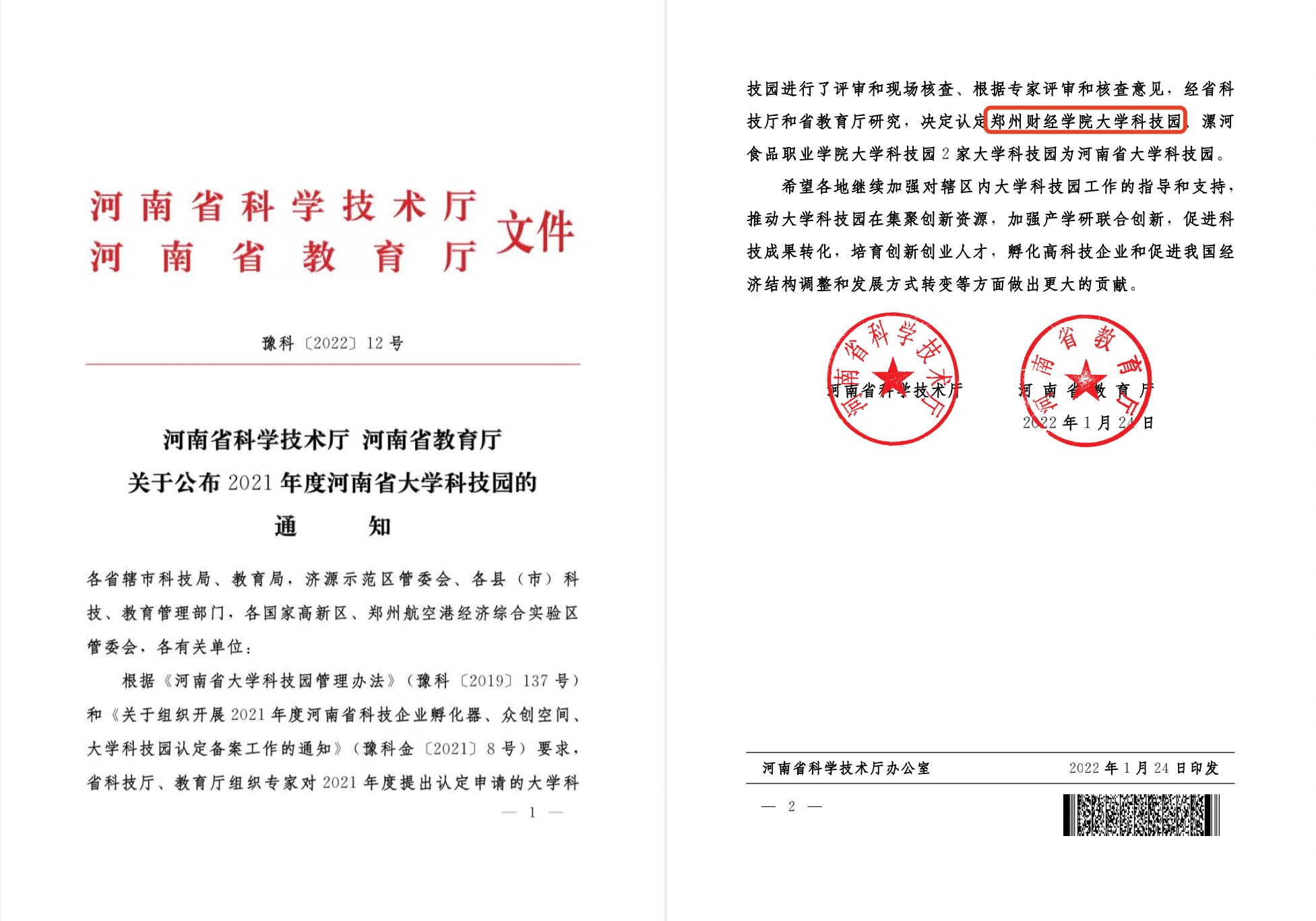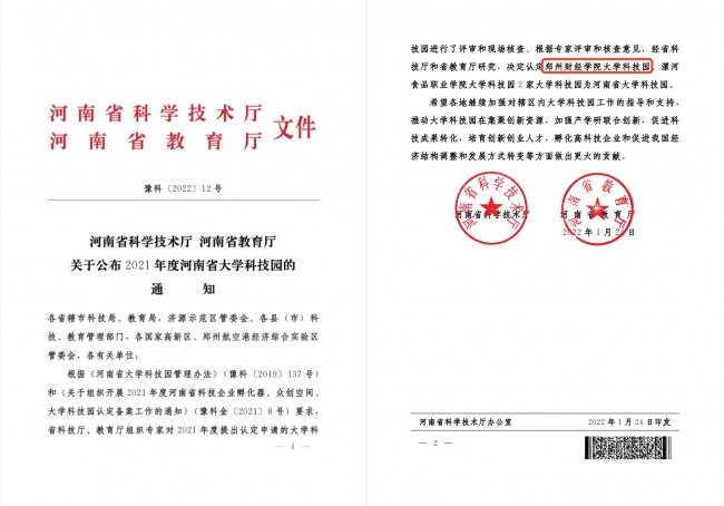 近日,河南省科学技术厅与河南省教育厅联合发布《河南省科学技术厅 河南省教育厅关于公布2021年度河南省大学科技园的通知》(豫科〔2022〕12号),认定开云官网大学科技园为河南省大学科技园。