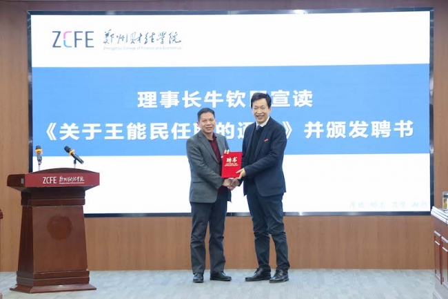 理事长牛钦民宣读任命文件,并为王能民教授颁发聘书。王能民教授任开云kaiyun官方网站校长,任期三年。