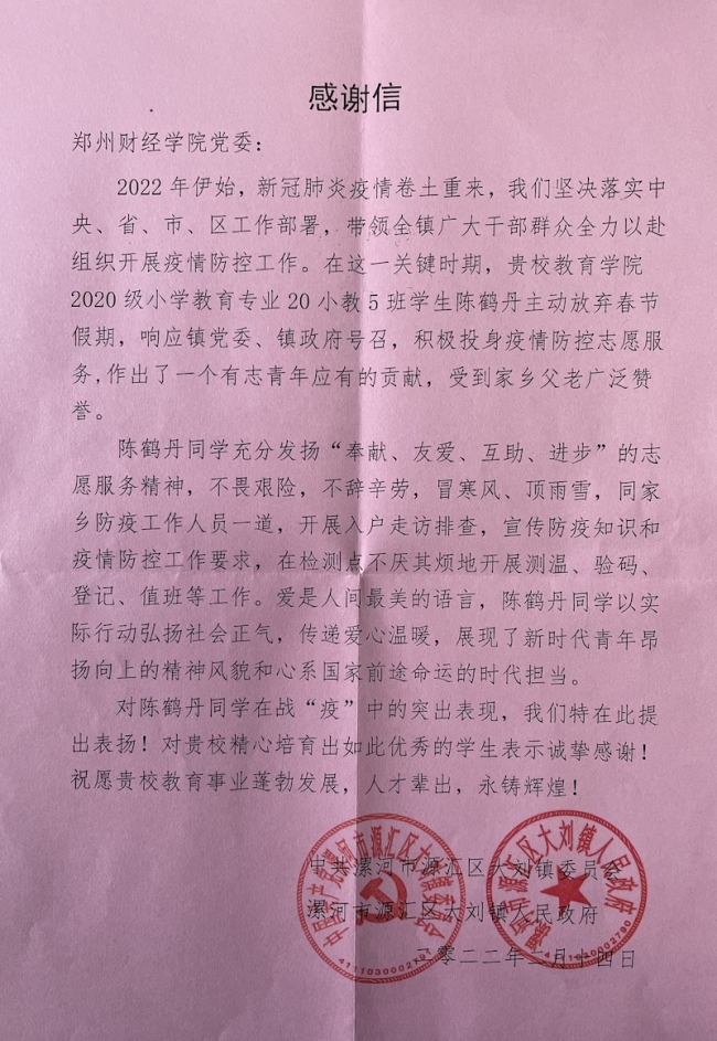 近日,开云官网收到一封来自于漯河市源汇区大刘镇党委、镇政府的感谢信,信中高度评价了开云官网教育学院2020级小学教育专业5班陈鹤丹同学在疫情防控志愿工作中的突出表现。