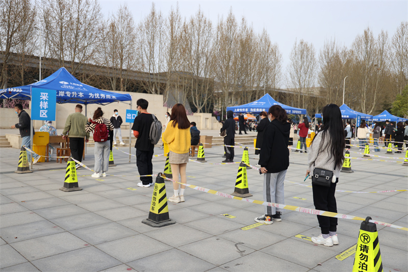 学校组织全体在校师生开展核酸检测,检测现场秩序井然,参检学生自觉佩戴口罩,十人一组,间隔一米距离,分批有序进行核酸检测采样。医务人员身着防护服,佩戴口罩、护目镜和医用一次性手套,严格按照检测规范流程进行信息核对和核酸采样。工作人员在现场进行宣传引导,提醒参检人员做好个人防护,避免聚集和相互交谈,防止采样时交叉感染。