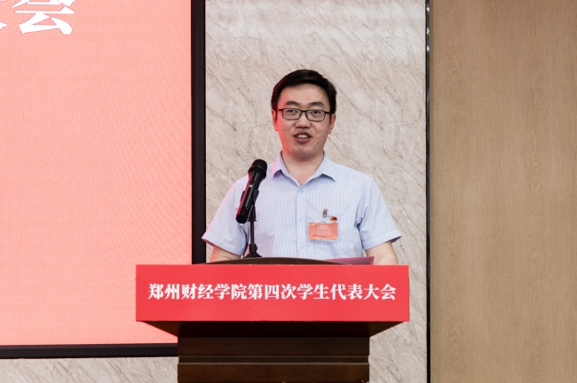校团委副书记余永明向大会致贺词。他总结了过去一年校学生会对青年学生在思想引领、校园文化、组织改革、权益维护、社会实践等方面取得的成果,指出学生会发挥着联系青年学生的桥梁和纽带作用,对学生会于工作中取得的突出成效,于促进学校深化改革、服务学生成长中发挥的重要作用予以肯定,并对新一届学生会提出三点期望,一是要坚定理想信念,志存高远,做筑牢理想信念之基的接班人;二是要守正创新,真抓实干,做脚踏实地的行路人;三是要锤炼本领,强化担当,做斗志昂扬的郑财人。