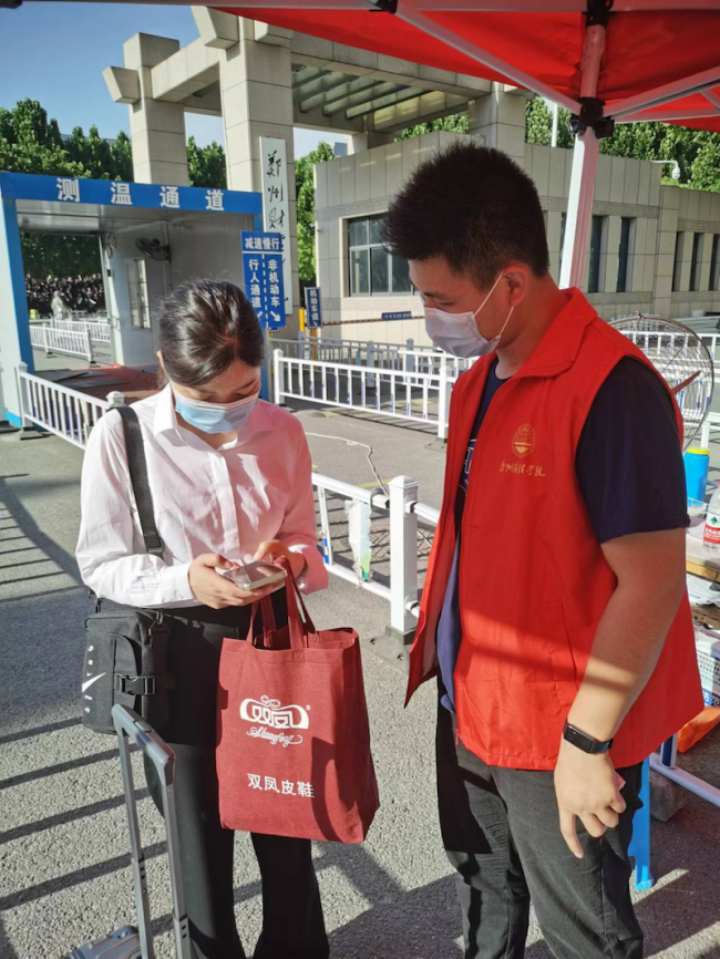 毕业生返校当天,信息工程学院的毕业生党员志愿者在离校前最后一刻,纷纷加入到为返校学生服务的队伍中,在学校南门、北门均能看到他们的身影,他们用自己的实际行动践行了一名共产党员的初心。