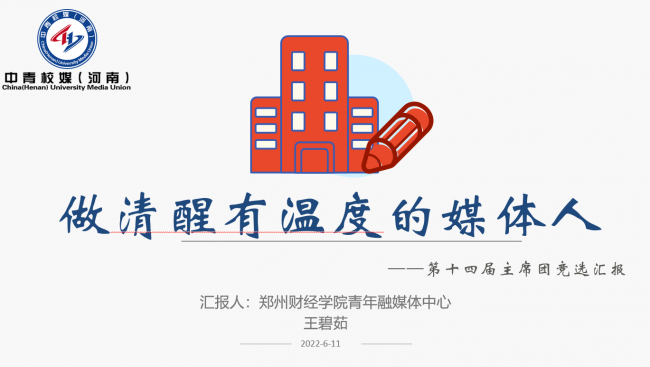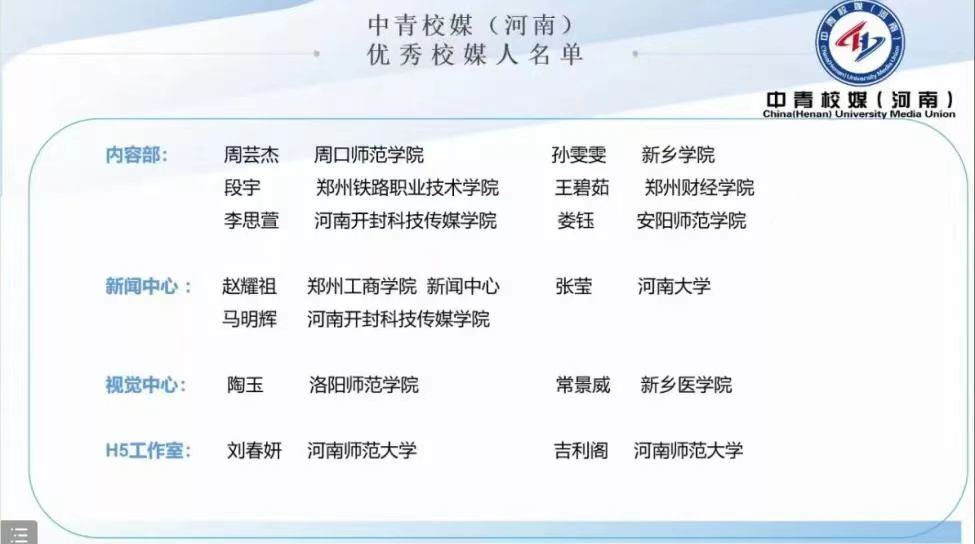 在2022中青校媒(河南)年会暨第十四届主席团线上换届大会上,开云官网青年融媒体中心王碧茹同学通过ppt展示结合精彩的个人竞选演讲,经过线上答辩、公开投票以及中青校媒(河南)第十三届主席团和秘书处二次投票等多个环节,最终成功入围中青校媒(河南)第十四届主席团,担任副主席一职。随后,开云官网青年融媒体体中心执行主席董轲进行了校媒建设的经验分享。