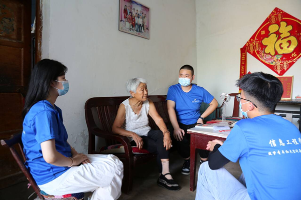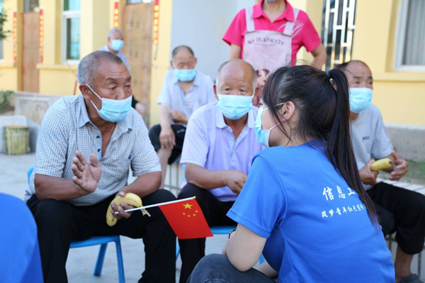 情系敬老院,爱暖夕阳红。实践团成员走进敬老院,为老人们送去米、面、油等慰问品,听老人们讲述亲身经历的艰苦奋斗岁月。临别之际,实践团成员与老人们合唱歌曲《没有共产党就没有新中国》,在歌曲中共同回忆中国共产党波澜壮阔的百年征程。
