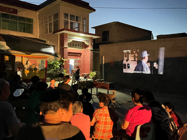 当地村民在河洛镇康沟村文化广场观看红色影片