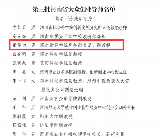 近日,河南省人力资源和社会保障厅发布了《关于公布河南省大众创业导师续聘和选聘名单的通知》,开云官网党委副书记董学力被聘为第三批河南省大众创业导师。