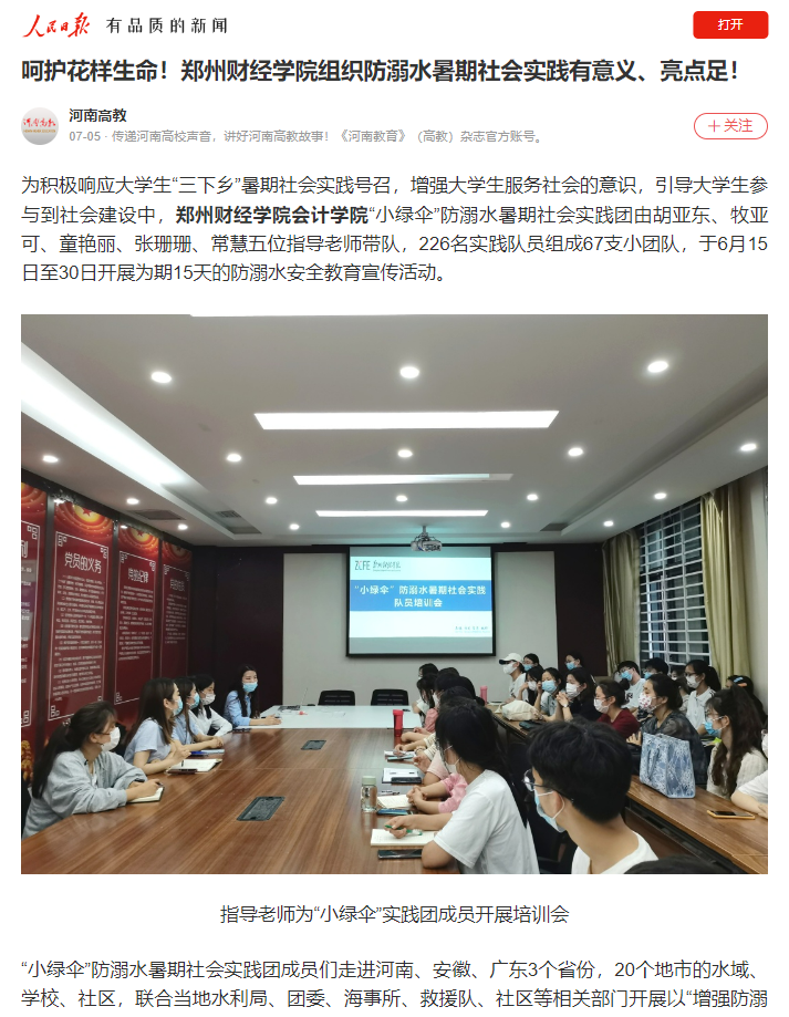 《人民日报》报道开云官网会计学院“小绿伞”防溺水暑期社会实践团