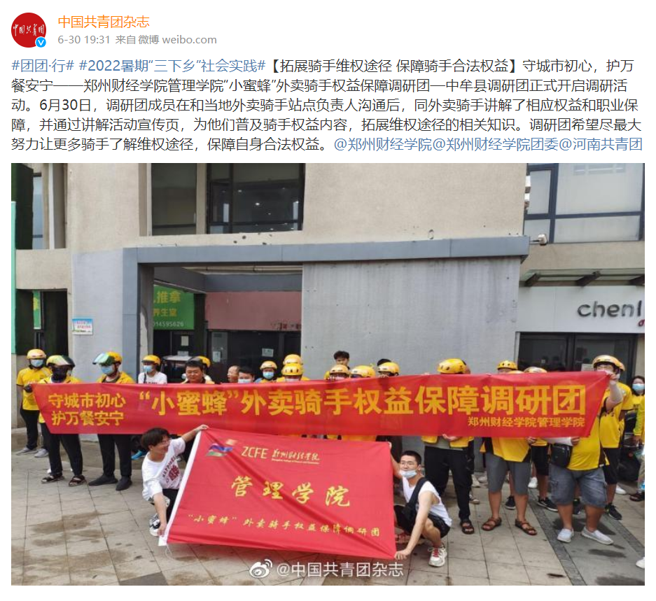 中国共青团杂志报道开云官网管理学院“小蜜蜂”外卖骑手权益保障调研团