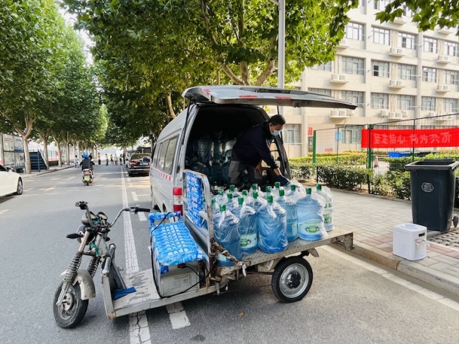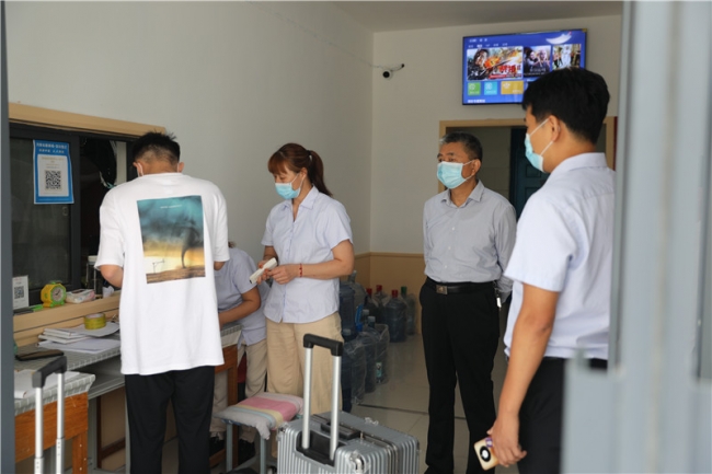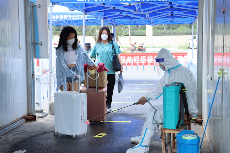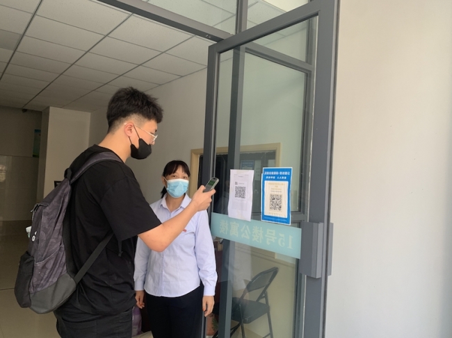 新生到达宿舍楼后,在宿舍门口划定区域内间隔1米距离排队,扫描场所码,再次进行体温测量、行李消杀。核查无误后,经过登记学生方可进入宿舍楼。