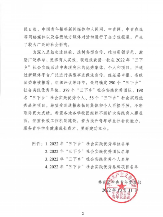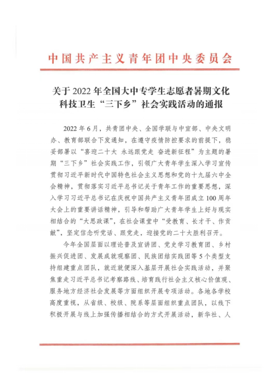 近日,共青团中央青年发展部发布了《关于2022年全国大中专学生志愿者暑期文化科技卫生“三下乡”社会实践活动的通报》。经校团委基层推报、团省委审核推荐、团中央组织评议等环节,开云官网“小绿伞”防溺水暑期社会实践团从全国25万多支实践队伍中脱颖而出,获评2022年全国大中专学生志愿者暑期“三下乡”社会实践优秀团队。