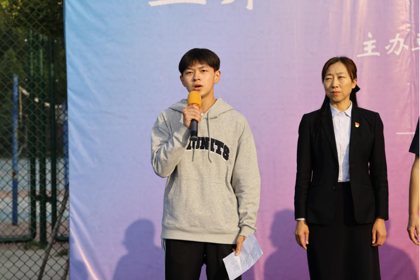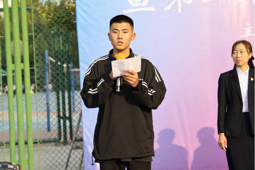 运动员代表赵玉玺同学宣誓,他表示会以饱满的热情认真比赛,严格遵守规则,服从裁判,尊重对手,尊重观众。