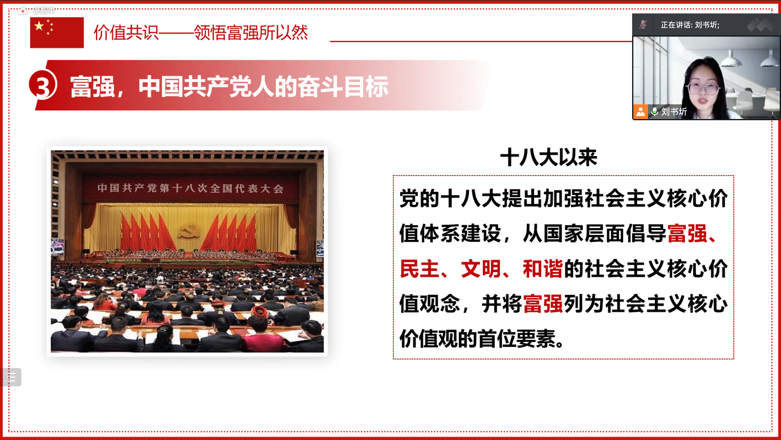 刘书圻围绕社会主义核心价值观“富强”的内涵与重大意义,从“价值共识——领悟富强所以然”“价值自信——坚定富强可以然”“价值自觉——明晰富强何以然”三个维度出发,结合大量史实及例证深入浅出地讲解了“富强”的科学内涵,从守初心、成大才、观世界三个方面讲述培育中国特色社会主义价值自觉的重要性,强调新青年要树立价值自信,坚定理想信念。