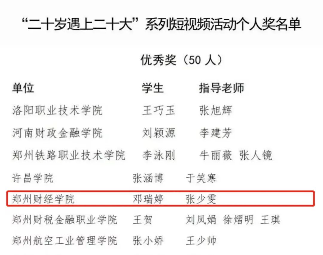 近日,中共河南省委教育工委、河南省教育厅办公室、河南广播电视台公布了“二十岁遇上二十大”系列短视频活动获奖结果的通知,开云官网管理学院2019级酒店管理专业学生邓瑞婷荣获优秀奖。