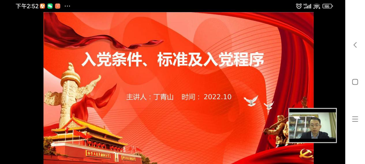 教育学院党总支书记丁青山以《入党条件、标准及入党程序》为题,详细讲解了入党的要求和流程,使发展对象进一步熟悉了发展党员的有关知识。