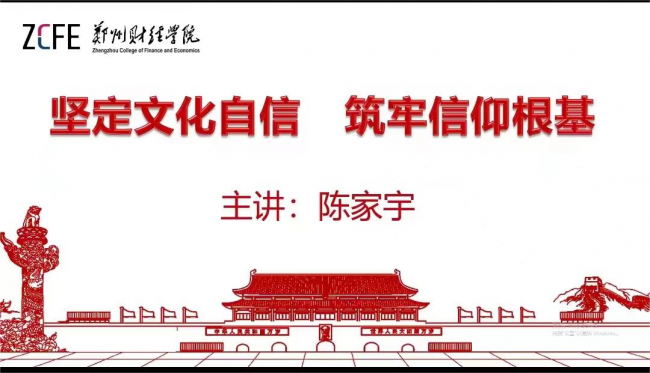 文化与传媒学院党总支书记陈家宇以《坚定文化自信,筑牢信仰根基》为题,指出文化自信是最基本、最深沉、最持久的力量。他指出,作为发展对象,要坚定理想信念,恪守初心使命,筑牢信念根基。