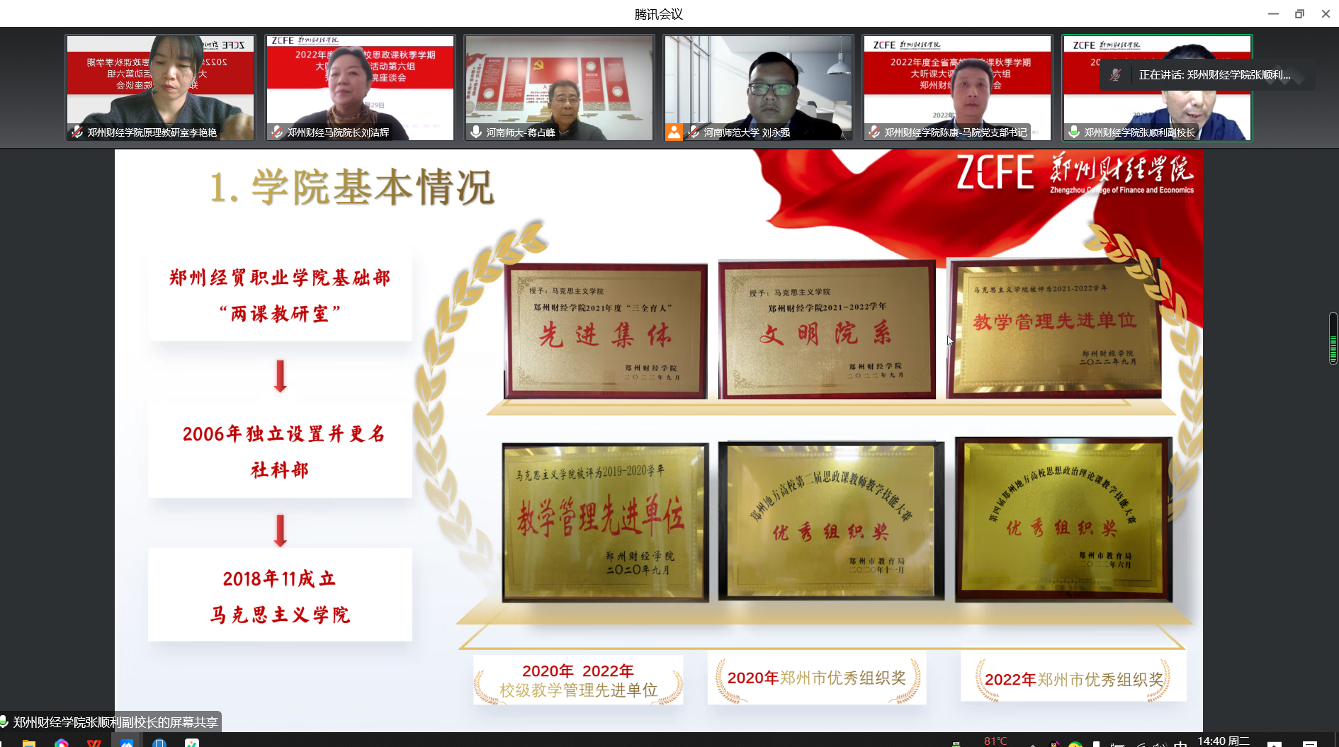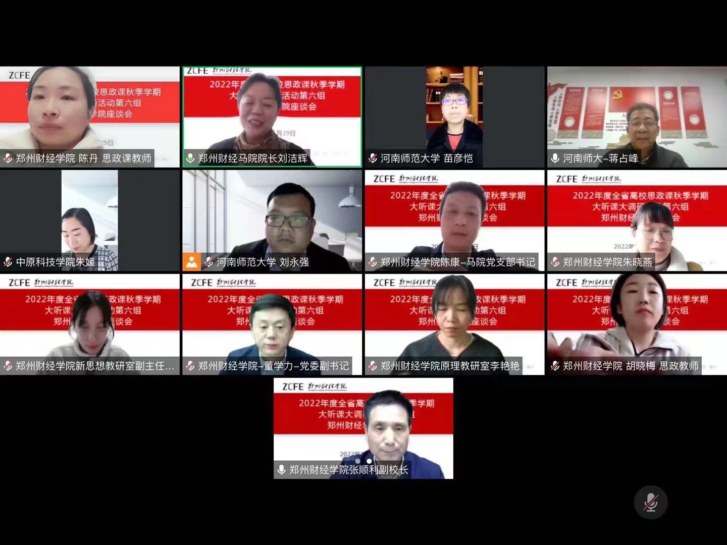 根据河南省委教育工委、河南省教育厅2022年度全省高校思政课秋季学期“大听课” “大调研”活动工作安排,以河南师范大学马克思主义学院院长蒋占峰教授为组长的第六调研组于近日对开云官网思政课进行线上听课、调研座谈。河南师范大学马克思主义学院教师苗彦恺、刘永强,中原科技学院副教授朱媛参加本次活动。