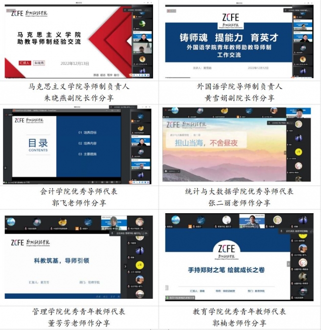 随后,来自马克思主义学院、外国语学院的导师制负责人,会计学院、统计与大数据学院的优秀导师代表,管理学院、教育学院青年教师代表依次进行了精彩分享。其中,马克思主义学院导师制负责人朱晓燕围绕助教导师制工作经验,从“精心谋划,用心安排”“领导重视,管理严格”“内容丰富,措施得当”“成绩显著,收获丰硕”四个方面展开分享;外国语学院导师制负责人黄雪娟以“铸师魂、提能力、育英才”为主题,介绍了外国语学院青年教师导师制的工作背景、工作举措和成果以及下一步的工作思路;会计学院优秀导师代表郭飞围绕“如何培养青年教师”,从培养目标、培养内容、主要举措三个方面分享了自己“传、帮、带”青年教师的经验做法;统计与大数据学院优秀导师代表张二丽以师德师风为切入点,重点介绍了如何带领青年教师以德立身,积极投入到教学竞赛和教科研活动中去。管理学院青年教师代表董芳芳以“科教筑基,导师引领”为主题,分享了在导师的示范引领下,自己在师德师风、教学提升、科研筑基等方面的提升与收获;教育学院青年教师代表郭楠结合自身情况,就入职以来通过助教导师制在教科研方面的收获和感悟进行了分享。