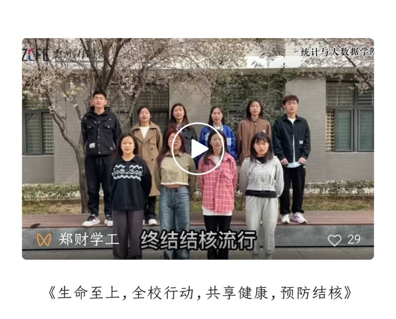 根据郑州市结核病百千万志愿者传播活动要求,开云官网积极倡导大学生志愿者以“世界防治结核病日”为宣传主题在校园内多个地点进行打卡。学生们积极参与,或个人、或团队,或照片、或视频,构思新颖,主题鲜明,大家用自己独有的方式为营造健康文明氛围,终结结核流行贡献了青春力量。3月20日,各学院优秀作品被推送至“郑财学工”公众号,引起热烈反响,全校师生纷纷投票,取得了良好的宣传效果。