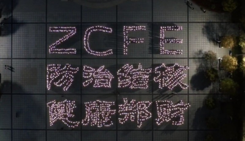学生志愿者点亮“ZCFE 防治结核,健康郑财”字样