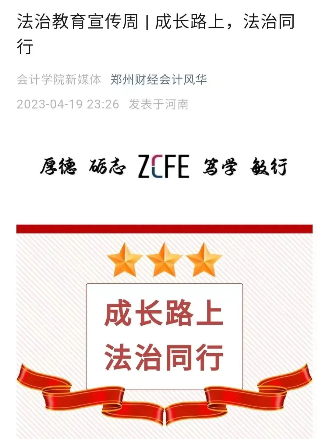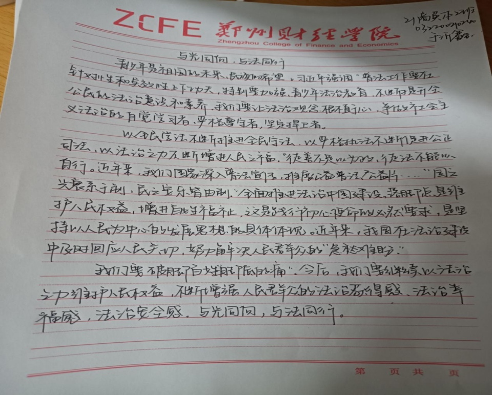 为教育引导学生人人知法、人人守法,牢固树立法治观念,切实提升师生法治意识和法治素养,围绕“成长路上 法治同行”组织开展征文活动。活动期间,各学院广泛动员,引导学生自主查阅资料文献,学习法律法规及法治社会建设相关内容,结合新时代大学生的使命与职责,深入思考,积极创作。