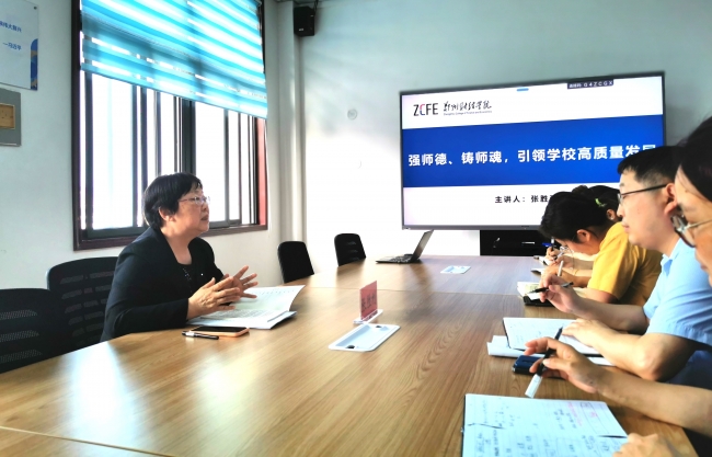 张胜利以《强师德、铸师魂,引领学校高质量发展》为题,从提高站位,充分认识师德师风的重要意义;坚定信念,做新时代“四有”好老师;以学促干,促进学校高质量发展三个方面进行了精彩讲解。她强调,要以习近平新时代中国特色社会主义思想为指引,将主题教育与师德师风建设相结合,将主题教育与业务工作相结合,将主题教育与学校发展相结合,不断引领学校更高质量的发展。