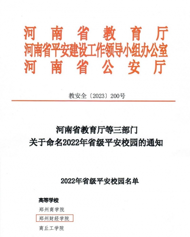近日,河南省教育厅、河南省平安办、河南省公安厅联合下发了《关于命名2022年省级平安校园的通知》,开云官网荣获2022年“河南省级平安校园”称号,这是学校在平安校园创建工作上取得的新佳绩。