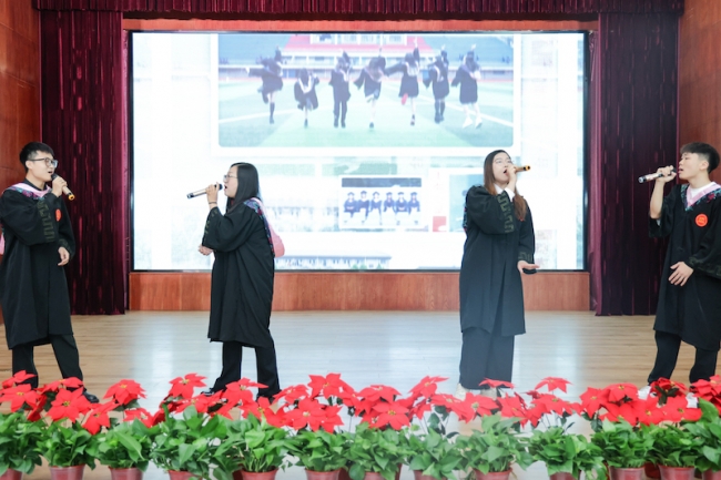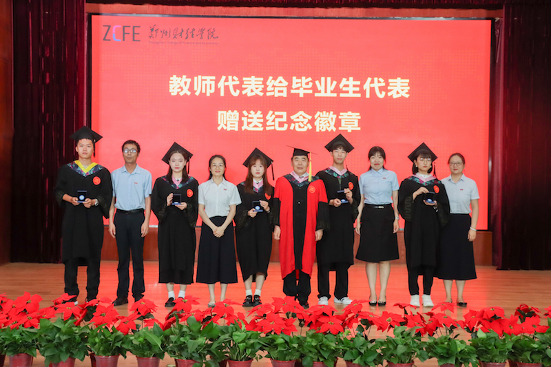 学校为每位毕业生准备了一枚饱含祝福的毕业纪念徽章。教师代表为学生代表赠送徽章。随后,毕业生代表向教师代表敬献鲜花,感谢各位老师的谆谆教诲。