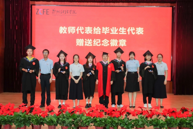 毕业生代表土木工程学院2019级土木工程本科2班王培传同学发言。他回忆了大学四年的点滴生活,大家相聚于金秋,离别于盛夏,四年流转,终有结局。他表示,希望毕业生们乘长风破万浪,去拼搏,去实践,把个人理想追求融入党和国家事业之中,去建设祖国的大好河山,在追梦的道路上奋勇前行,无愧时代赋予的使命,争做出彩郑财人。